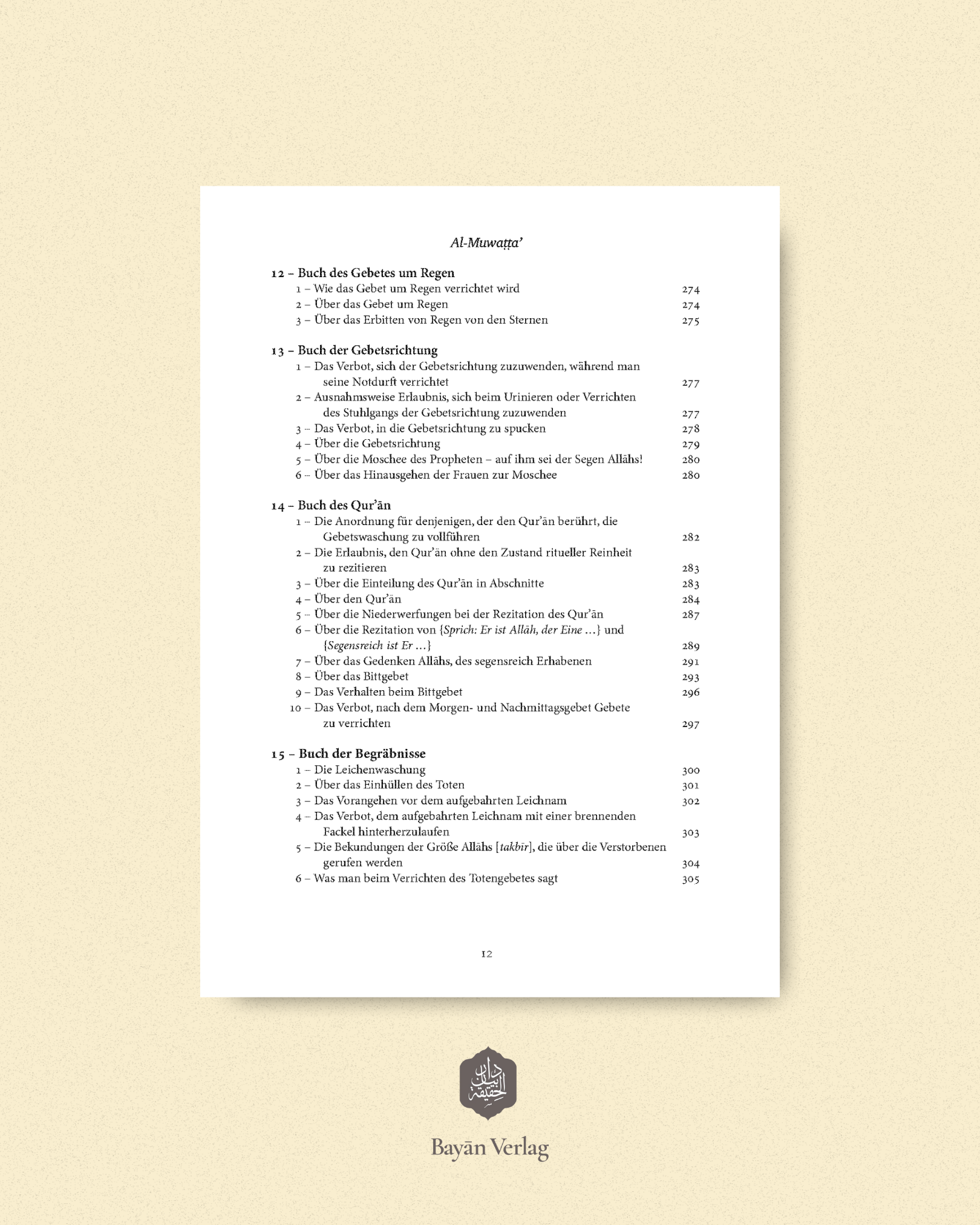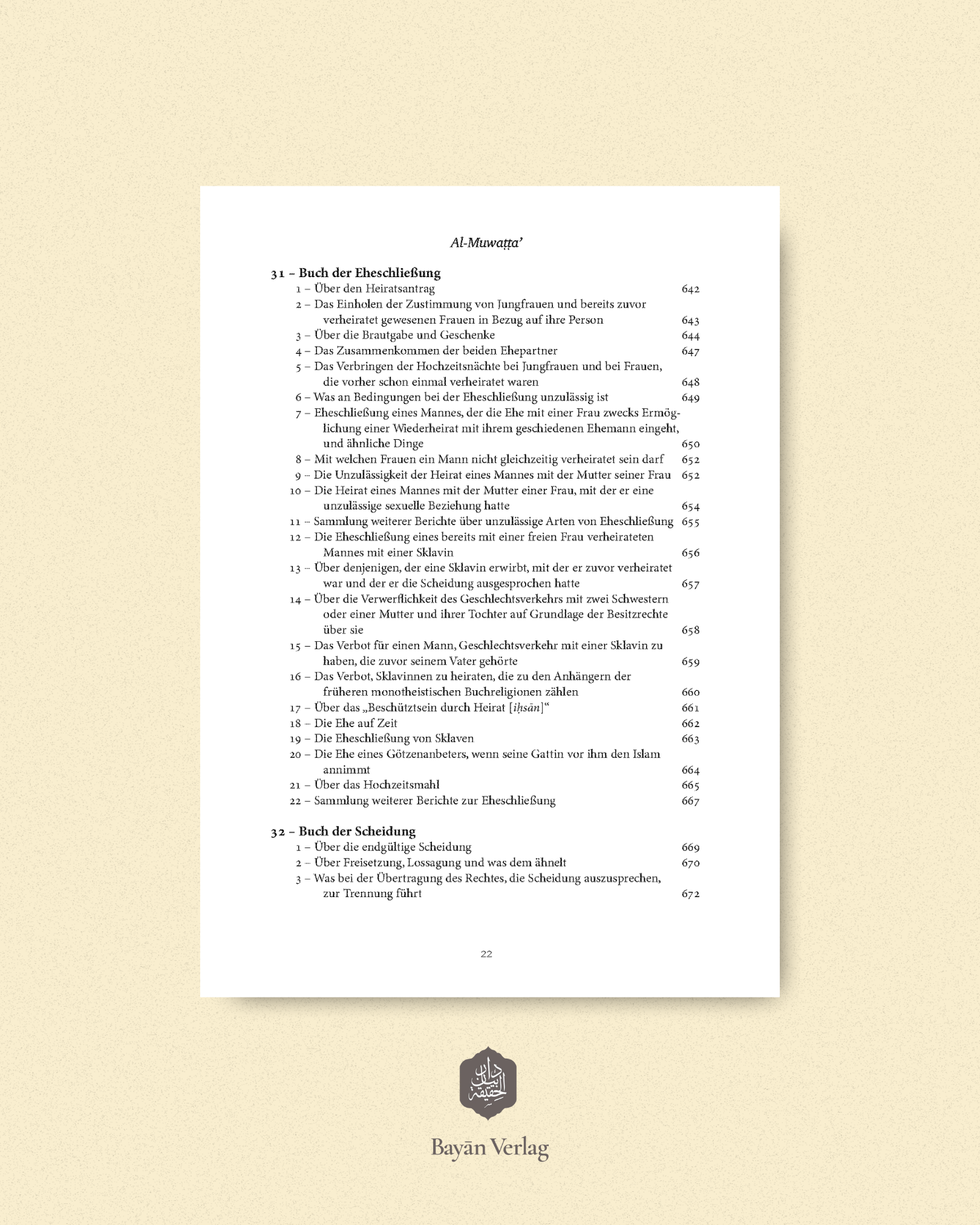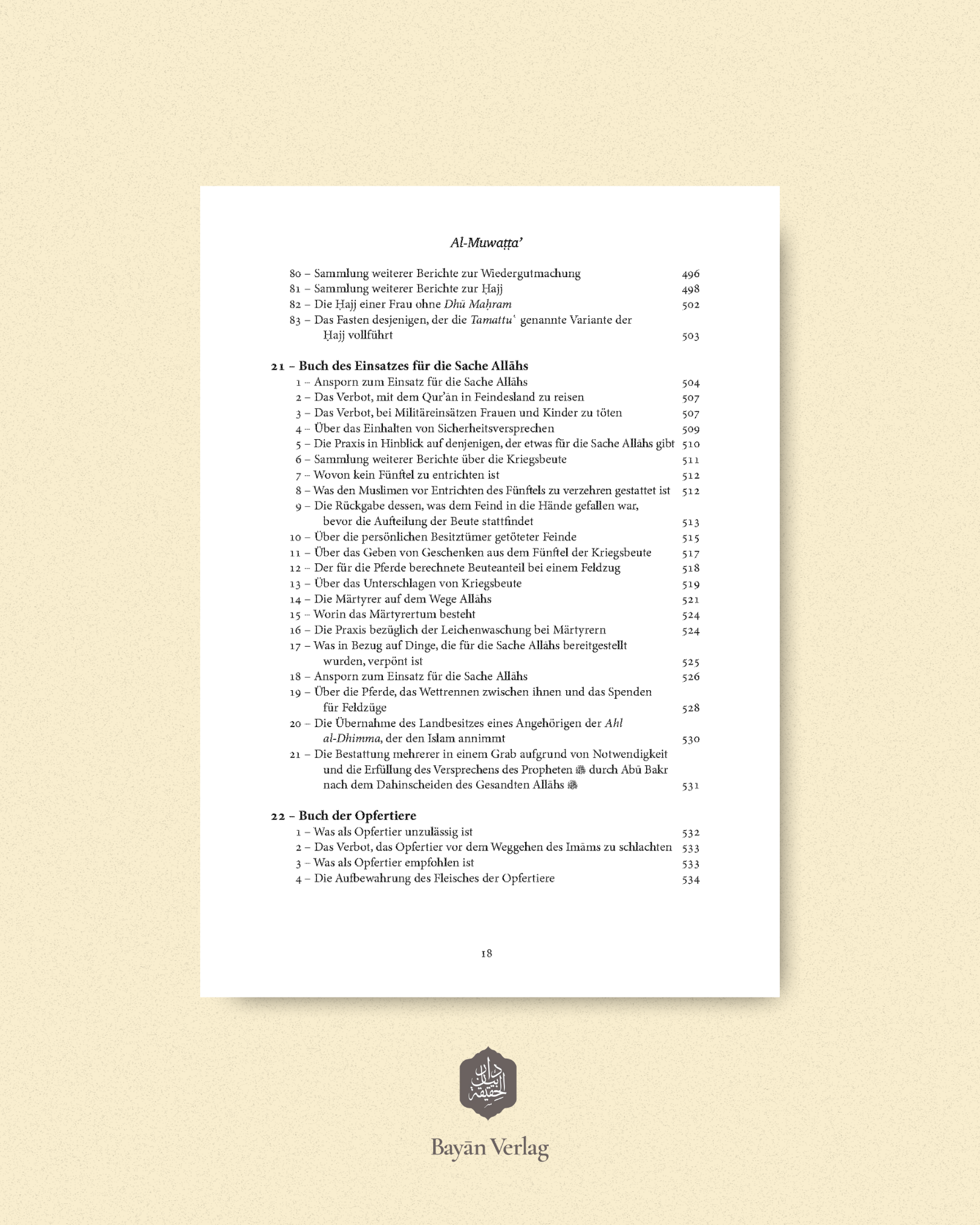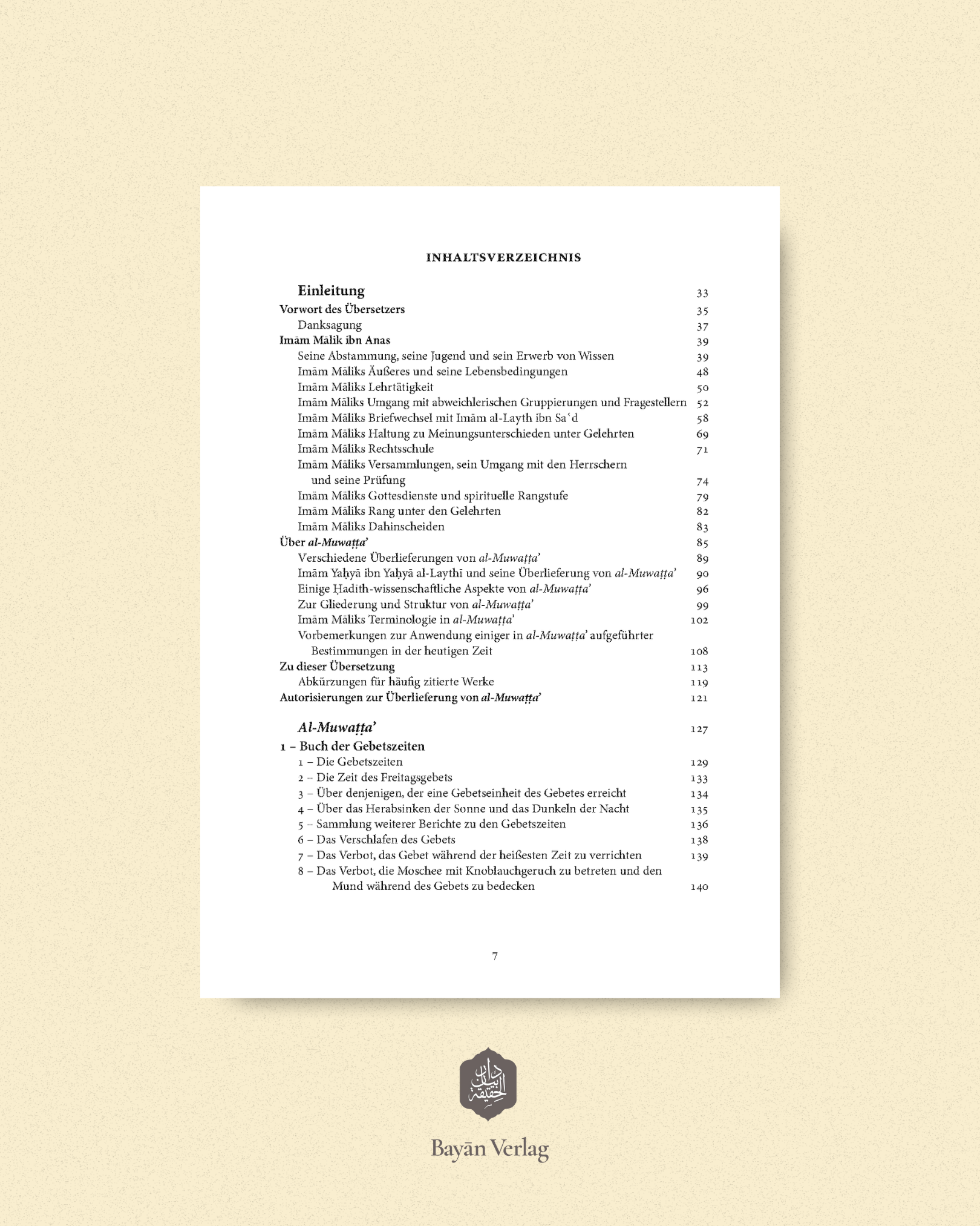 Imām Māliks hier in deutscher Übersetzung präsentiertes Kitāb al-Muwaṭṭa’ ist eine thematisch nach Bereichen der islamischen Rechtslehre geordnete Sammlung von Berichten über Aussagen und Handlungen des Propheten – Allāh segne ihn und schenke ihm Frieden –, seiner Gefährten und deren Nachfolger, deren Fatwas sowie Erklärungen und Rechtsgutachten Imām Māliks. Es fällt damit sowohl in das Fachgebiet der Ḥadīthe als auch in das der Rechtswissenschaft [fiqh], stellt jedoch darüber hinaus ein wertvolles historisches Dokument in Hinblick auf die religiöse Praxis und Rechtsfindung in Medina bis zur Hälfte des zweiten Jahrhunderts nach der Auswanderung des Propheten – Allāhs Segen und Sein Friede seien auf ihm – dar.