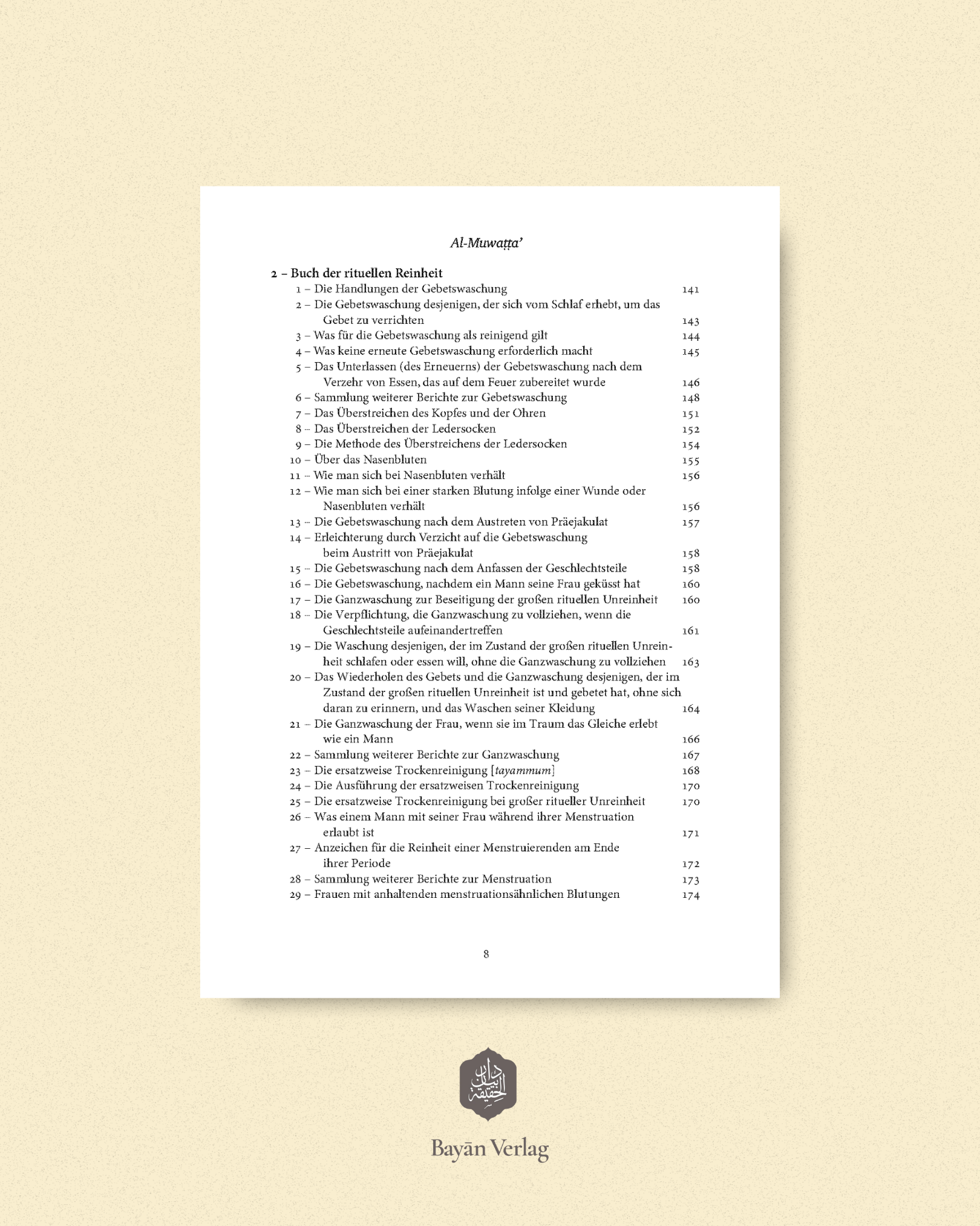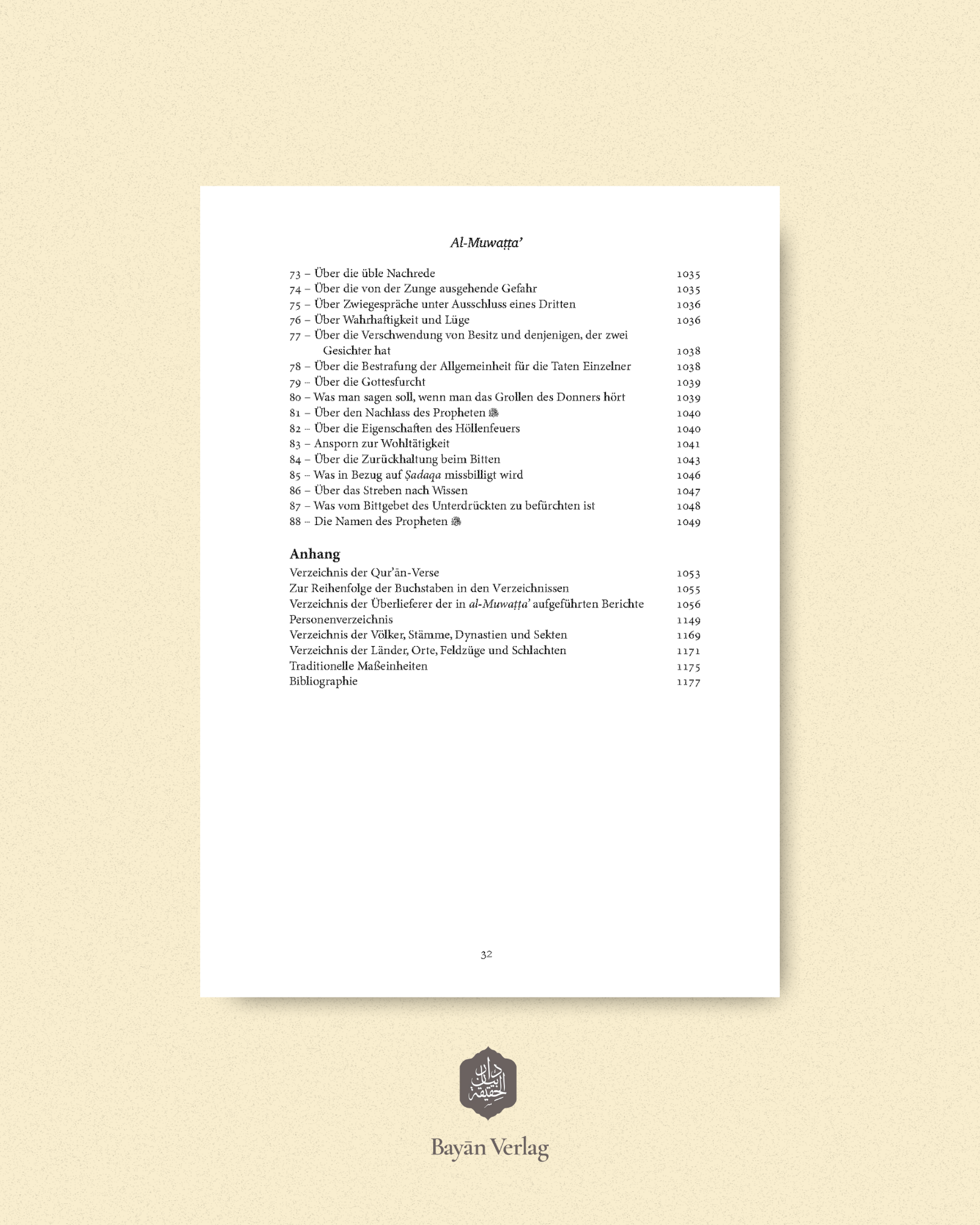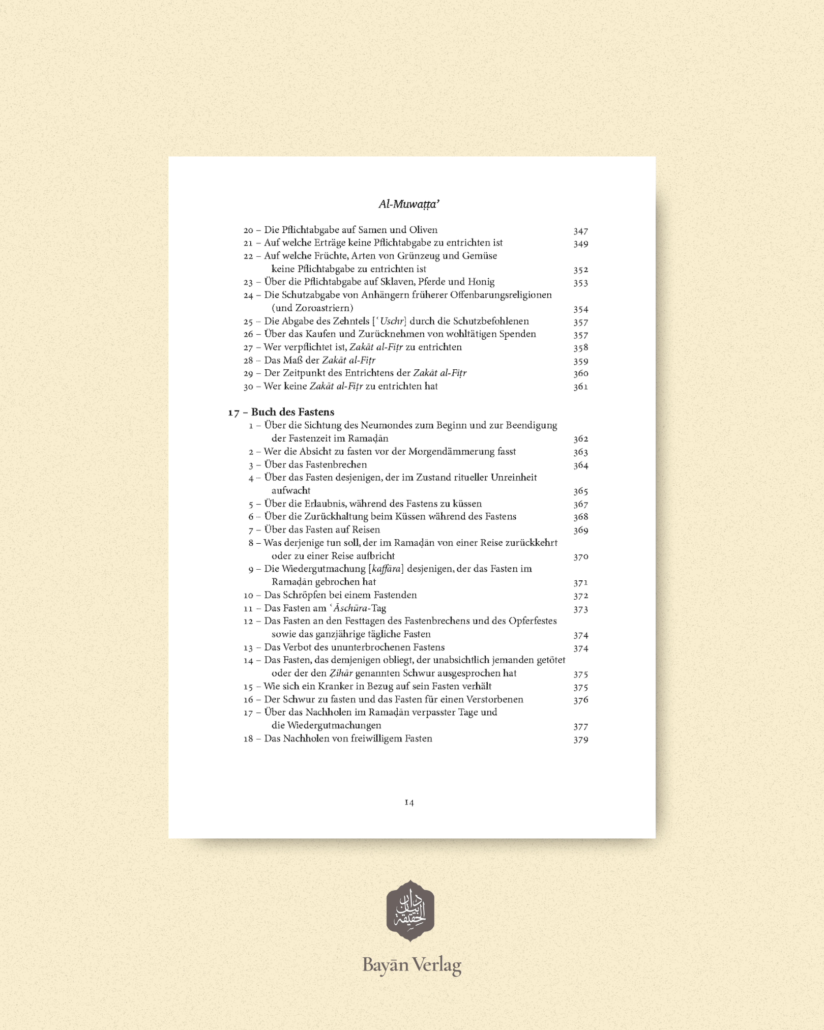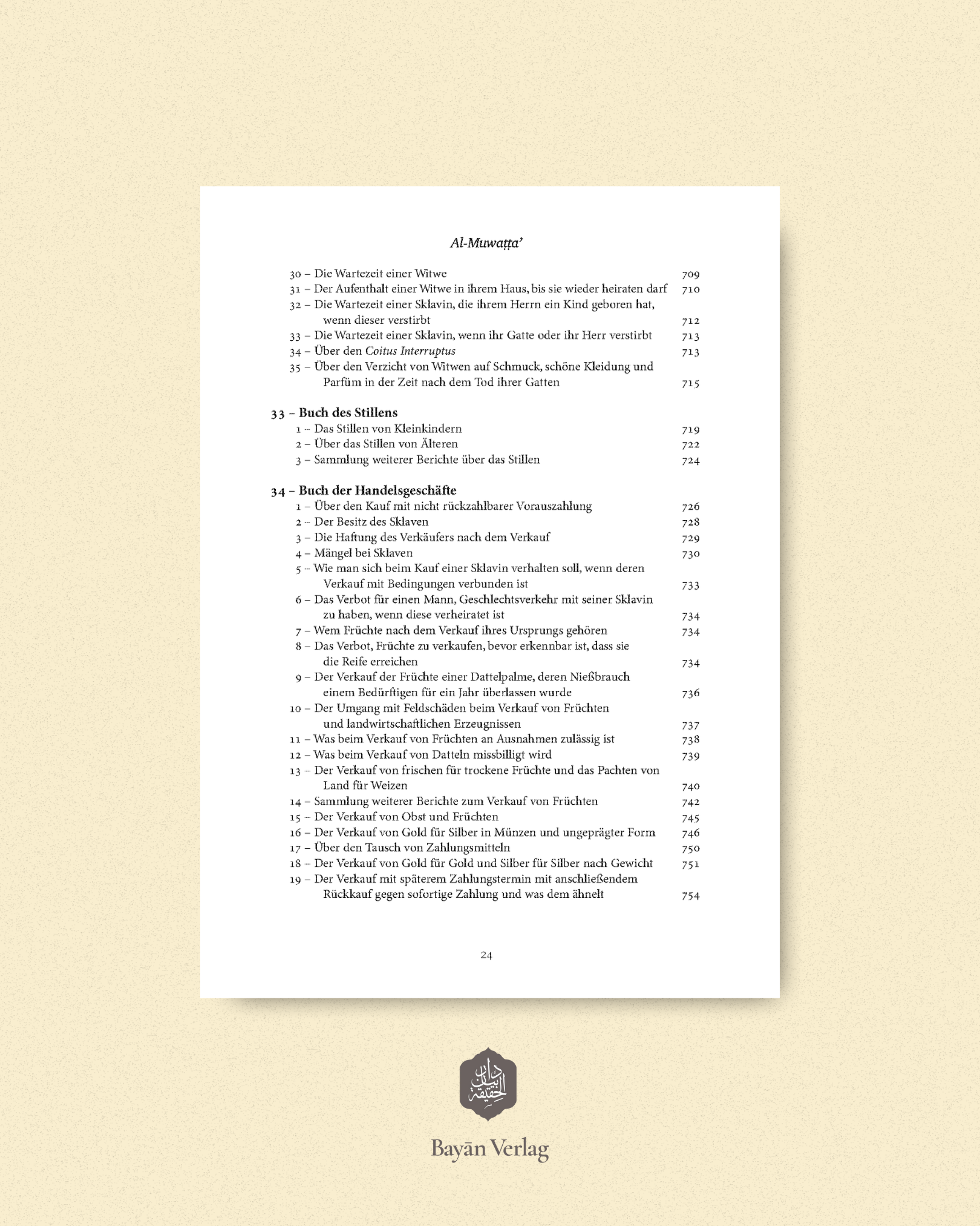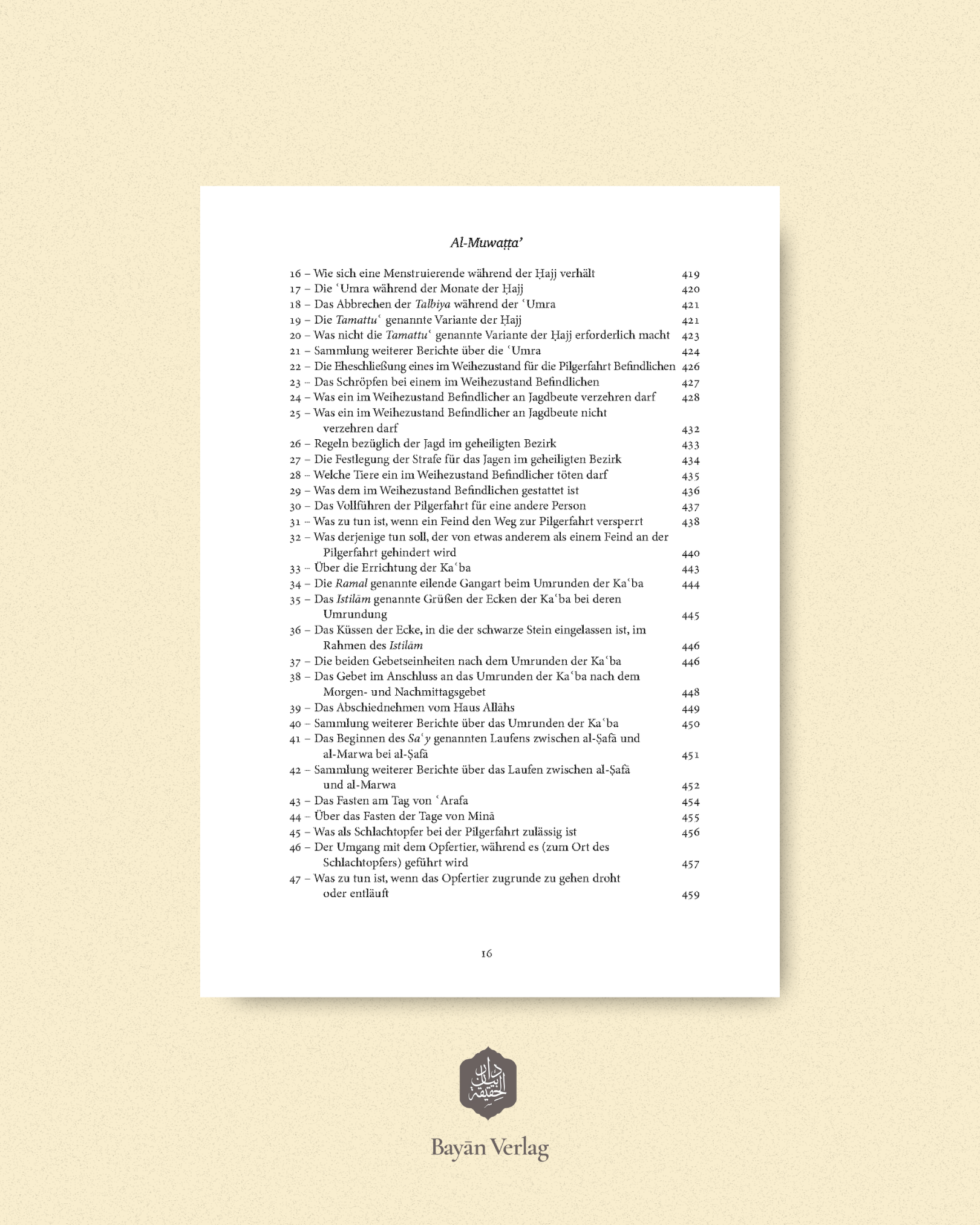 Imām Māliks hier in deutscher Übersetzung präsentiertes Kitāb al-Muwaṭṭa’ ist eine thematisch nach Bereichen der islamischen Rechtslehre geordnete Sammlung von Berichten über Aussagen und Handlungen des Propheten – Allāh segne ihn und schenke ihm Frieden –, seiner Gefährten und deren Nachfolger, deren Fatwas sowie Erklärungen und Rechtsgutachten Imām Māliks. Es fällt damit sowohl in das Fachgebiet der Ḥadīthe als auch in das der Rechtswissenschaft [fiqh], stellt jedoch darüber hinaus ein wertvolles historisches Dokument in Hinblick auf die religiöse Praxis und Rechtsfindung in Medina bis zur Hälfte des zweiten Jahrhunderts nach der Auswanderung des Propheten – Allāhs Segen und Sein Friede seien auf ihm – dar.