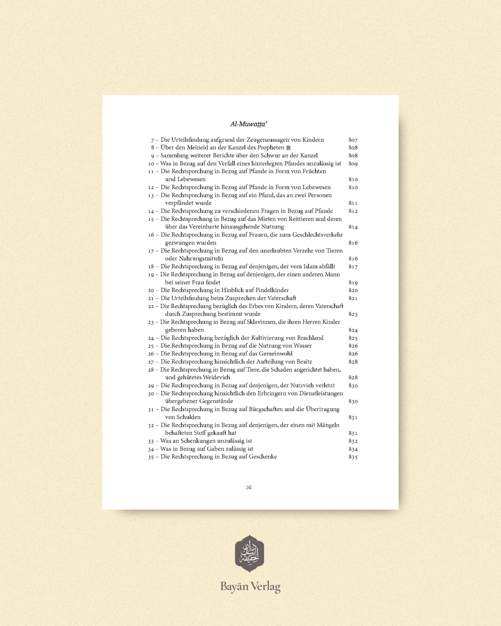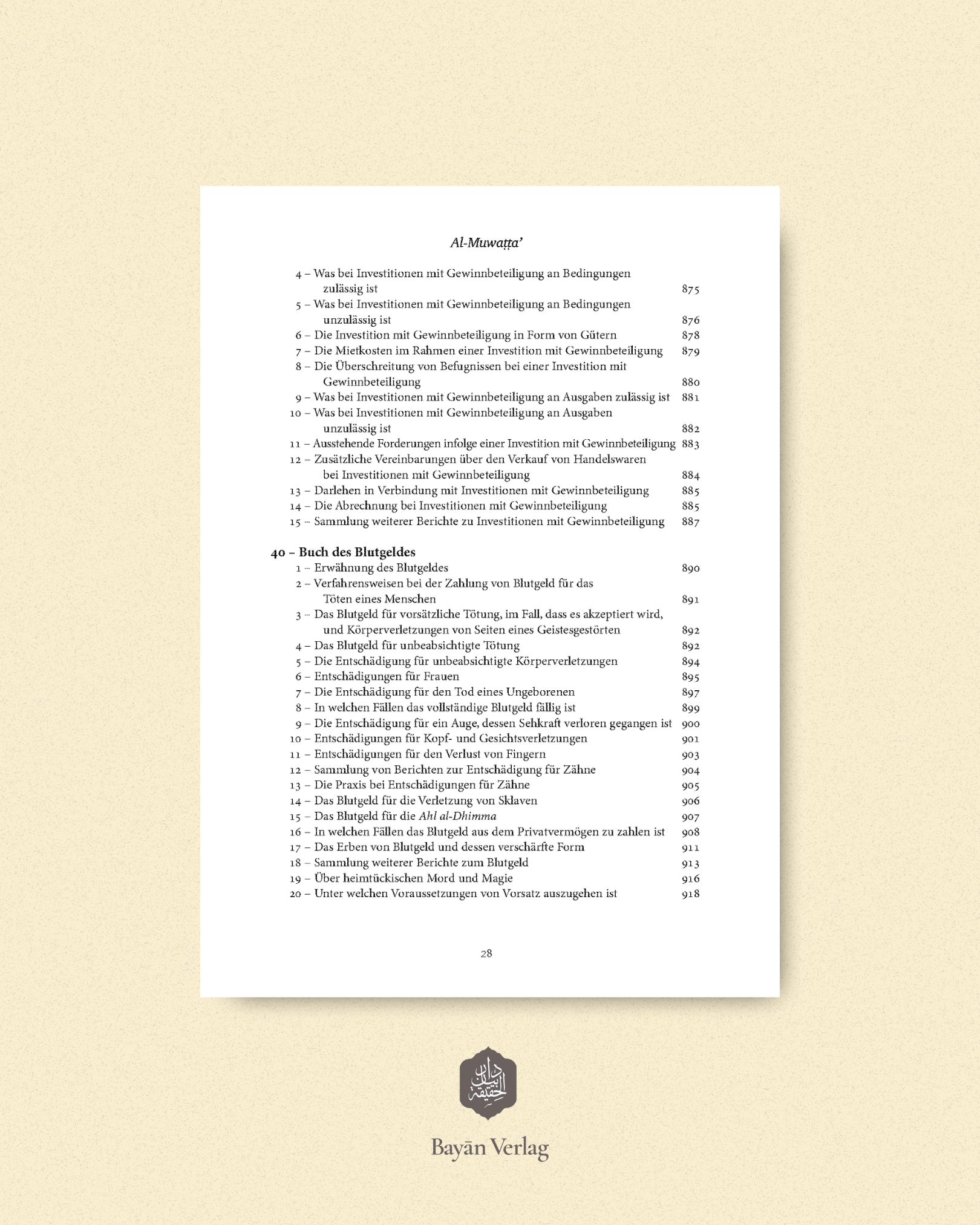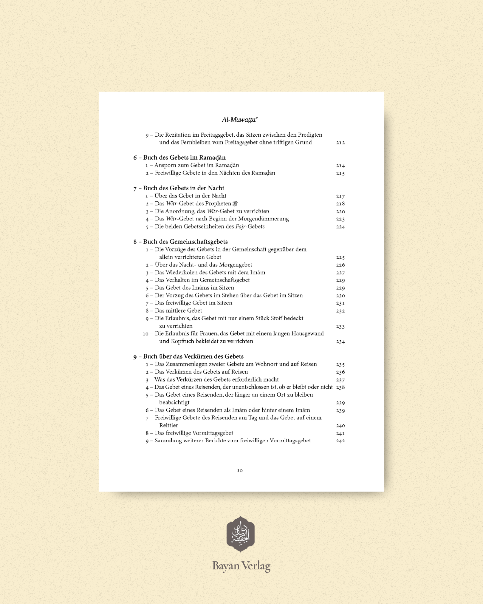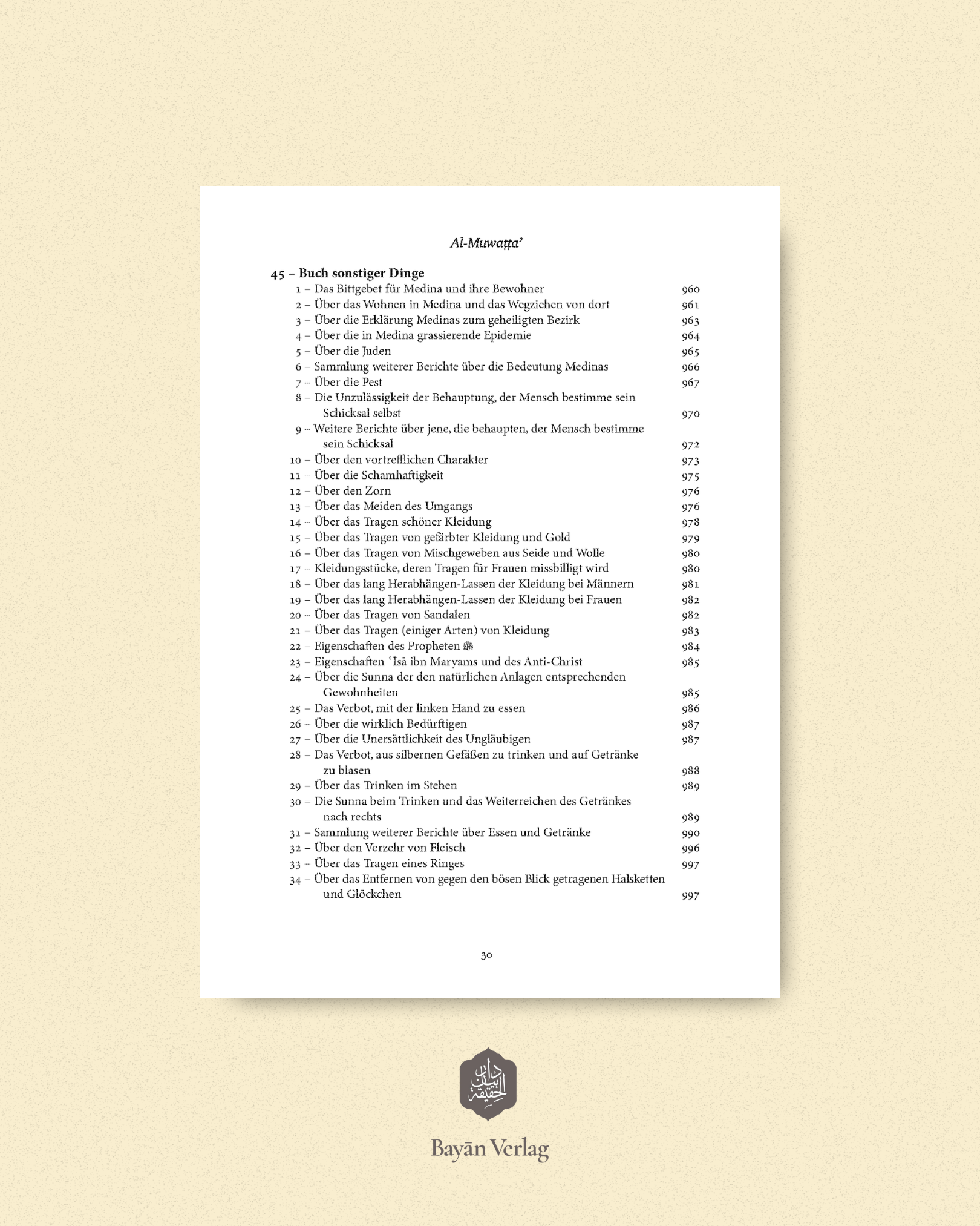 Imām Māliks hier in deutscher Übersetzung präsentiertes Kitāb al-Muwaṭṭa’ ist eine thematisch nach Bereichen der islamischen Rechtslehre geordnete Sammlung von Berichten über Aussagen und Handlungen des Propheten – Allāh segne ihn und schenke ihm Frieden –, seiner Gefährten und deren Nachfolger, deren Fatwas sowie Erklärungen und Rechtsgutachten Imām Māliks. Es fällt damit sowohl in das Fachgebiet der Ḥadīthe als auch in das der Rechtswissenschaft [fiqh], stellt jedoch darüber hinaus ein wertvolles historisches Dokument in Hinblick auf die religiöse Praxis und Rechtsfindung in Medina bis zur Hälfte des zweiten Jahrhunderts nach der Auswanderung des Propheten – Allāhs Segen und Sein Friede seien auf ihm – dar.