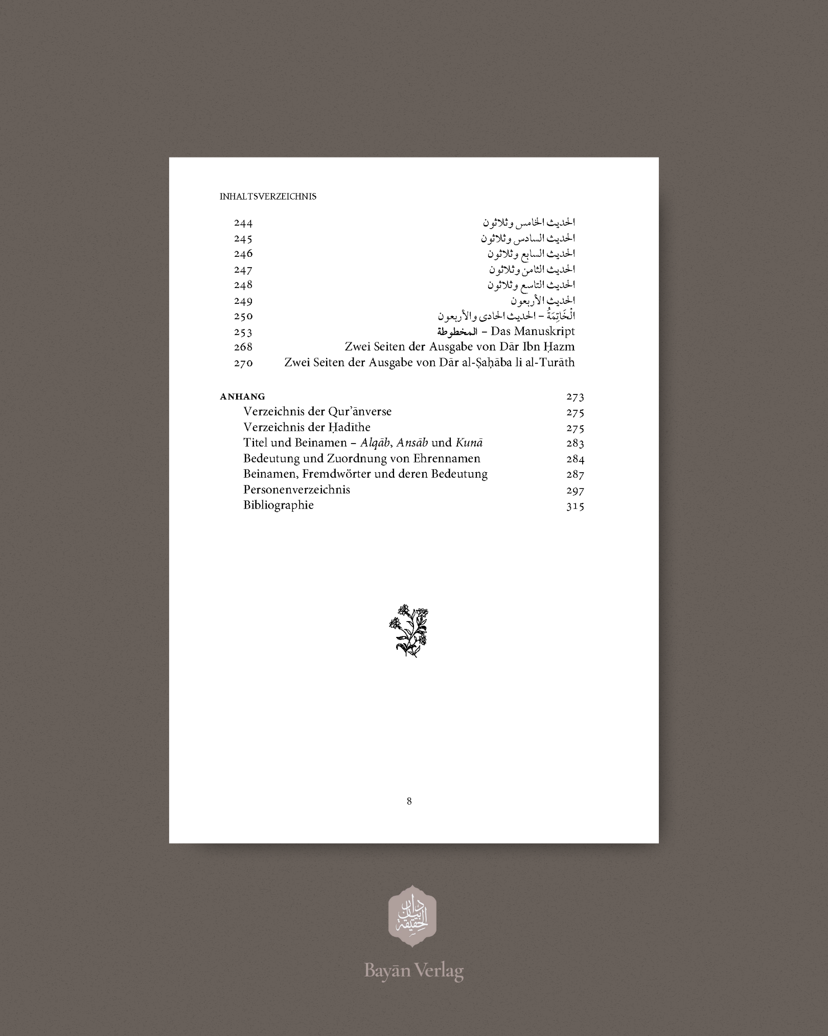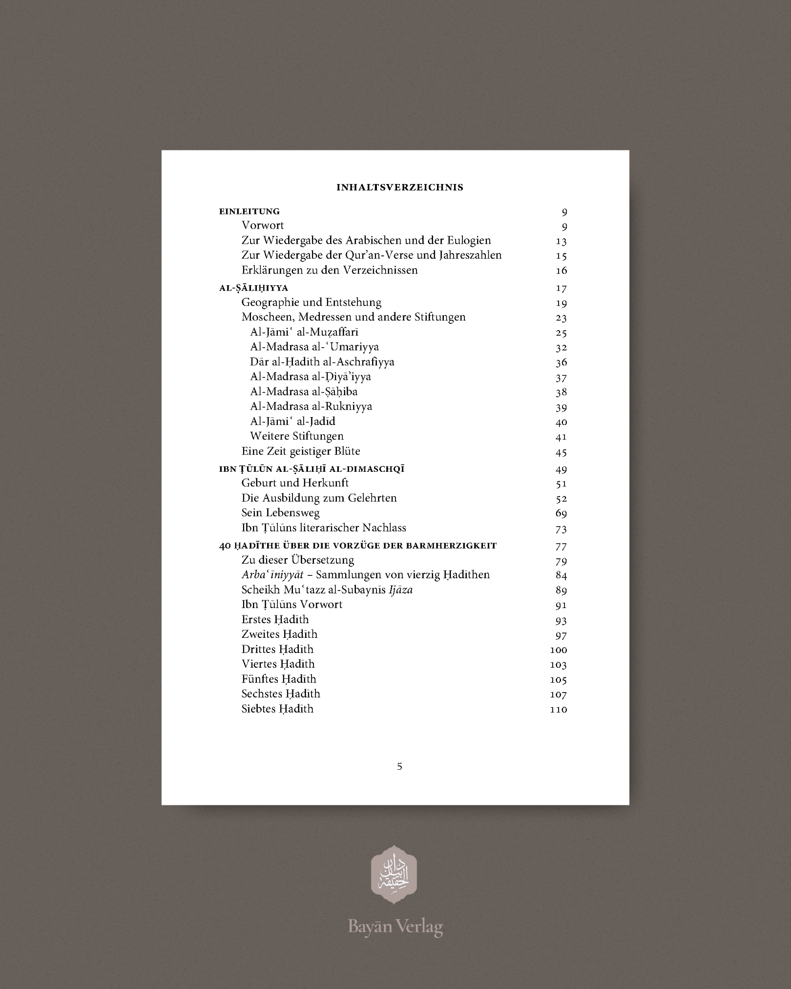 Der hier vorgelegte zweite Band von Damaszener Impressionen enthält in drei Kapiteln die Entstehungsgeschichte des am Hang des Berges Qasyūn in Damaskus gelegenen Ortes al-Ṣāliḥiyya, eine Biographie des dorther stammenden Gelehrten Scheikh Schams al-Dīn Ibn Ṭūlūn al-Ṣāliḥī al-Dimaschqī sowie die Übersetzung einer von ihm verfassten Sammlung vierzig prophetischer Traditionen über die Vorzüge der Barmherzigkeit. Darüber hinaus beinhaltet das Buch den arabischen Originaltext dieser Ḥadīth-Sammlung, deren Manuskript und einen Anhang mit Indices der Qur’ān-Verse, Berichte und Personen sowie ein Verzeichnis mit Übersetzungen und Erläuterungen arabischer Begriffe, Beinamen und Titel und eine umfassende Bibliographie.