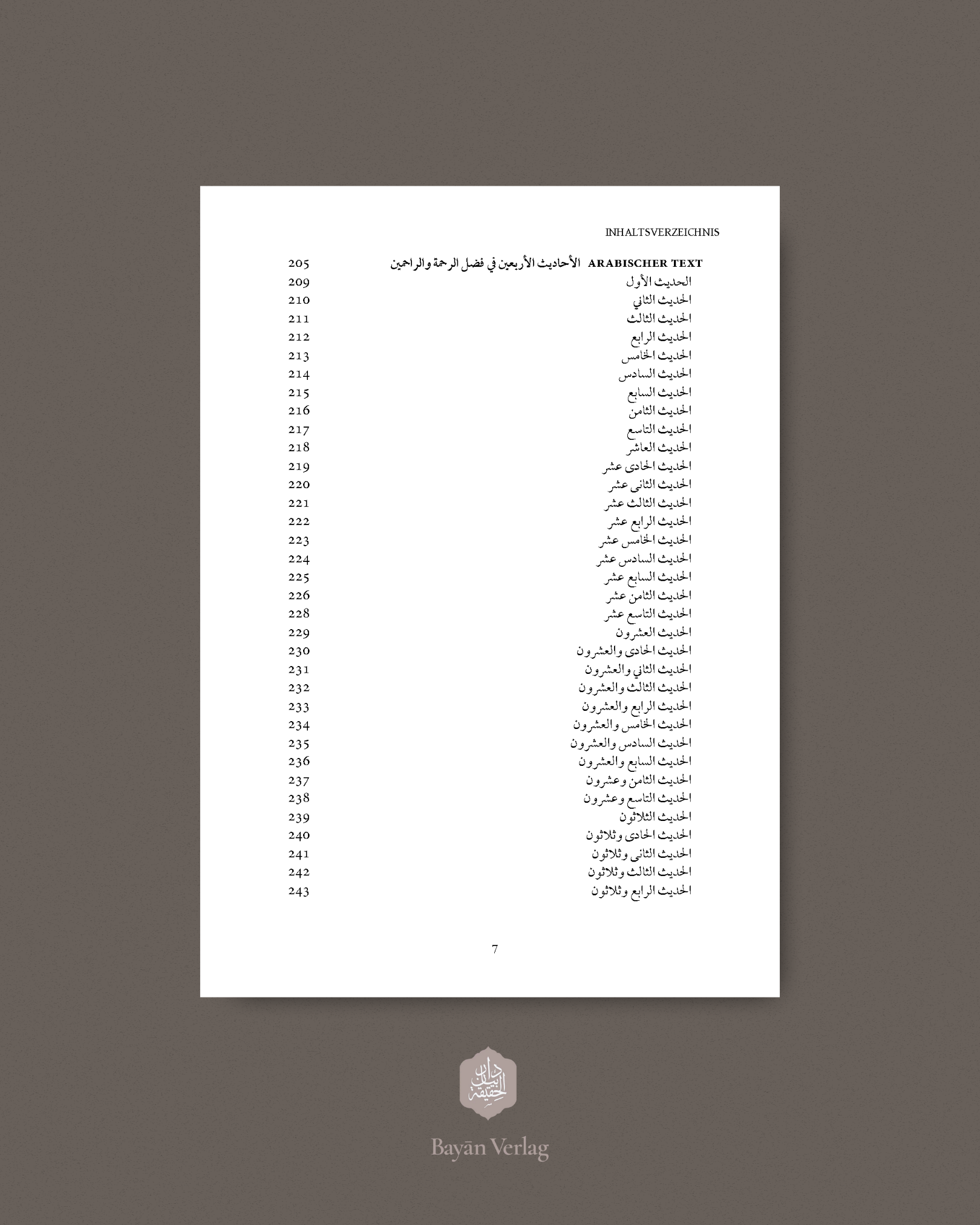 Ibn Ṭūlūns Sammlung von vierzig Prophetenworten unter dem Titel al-Aḥādīth al-Arbaʿīn fī Faḍl al-Raḥma wa al-Rāḥimīn ist ein typisches Beispiel für die unzähligen kleineren Ḥadīth-Sammlungen, welche die Experten auf diesem Gebiet bis in unsere Tage zum Nutzen der Muslime verfasst haben. Über den Wortlaut und Inhalt der Aussagen des ehrwürdigen Propheten ﷺ hinaus stellt dieses Werk einen Beleg für die Lebendigkeit der Kunst der Überlieferung im Islam weit über deren formative Periode hinaus dar. Die hier präsentierte, ausführlich annotierte Übersetzung vermittelt dem Leser Einblicke in dieses weitläufige Wissensgebiet, eröffnet ihm ein Verständnis historischer Zusammenhänge und bietet sich zugleich mit ihren zahlreichen Erklärungen und der umfassenden Dokumentation der biographischen Details der Überlieferer als Lehrmaterial für Studien der Ḥadīth-Wissenschaften an.
